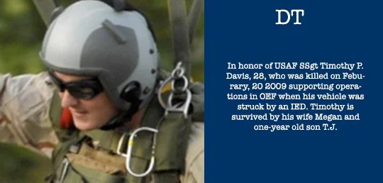 The background on DT : In honour of US Air Force SSgt Timothy P. Davis, 28, who was killed on Feburary, 20 2009 supporting operations in OEF when his vehicle was struck by an IED. Timothy was survived by his wife Megan and his son, T.J., who was one year old when he passed.